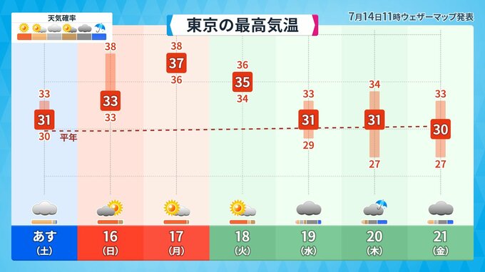 15日…31℃ 16日…33℃ 17日…37℃ 18日…35℃