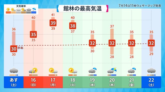 東日本では7月16日から19日にかけて、西日本では7月16日から18日にかけて、高気圧に覆われるため晴れる所が多い見込みです。場所によっては40℃近い最高気温が予想されているところもあり、特に3連休は暑さによる熱中症に注意、警戒が必要です。【写真に15~21日までの各地の予想最高気温】