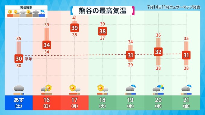 15日…30℃ 16日…35℃ 17日…39℃ 18日…38℃