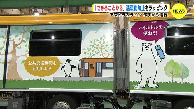 先頭車両には広島城や原爆ドーム・マツダスタジアムといった広島ならではの街並みが描かれていたり、ほかの車両にはシロクマの子ども「クマクマ」が、シャワーをこまめに止めることや、ペンギンの「ペン太」は公共交通機関を利用しようと身近なところからできる省エネルギー活動を紹介しています。