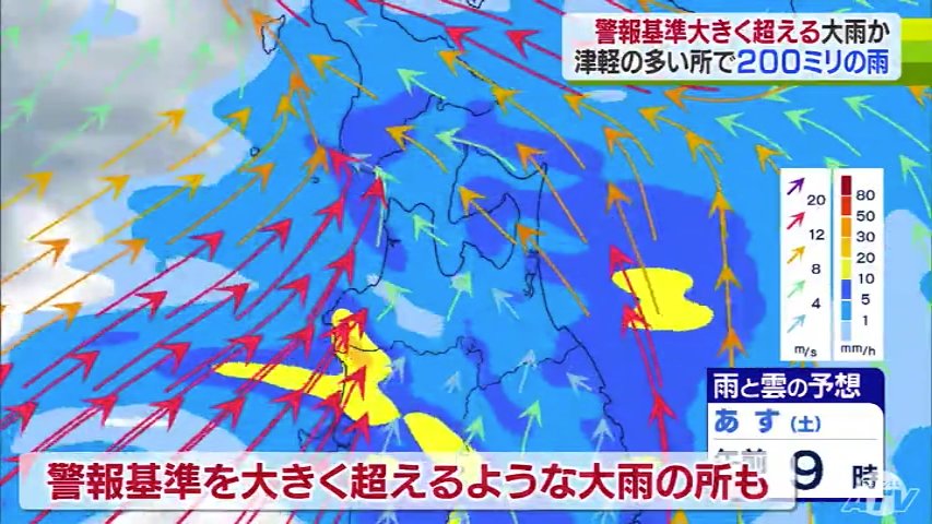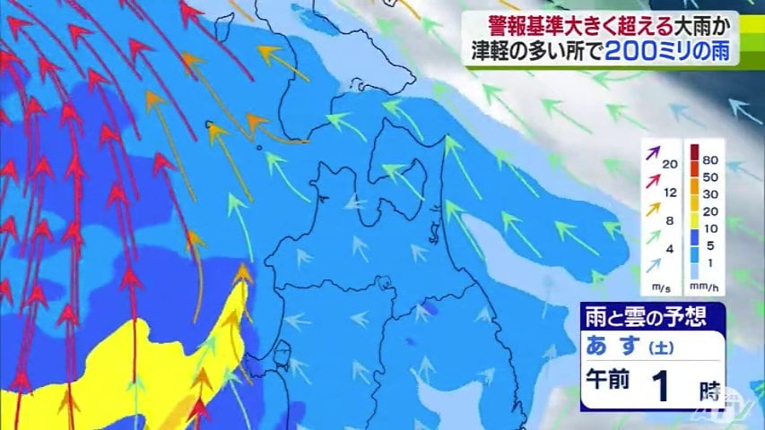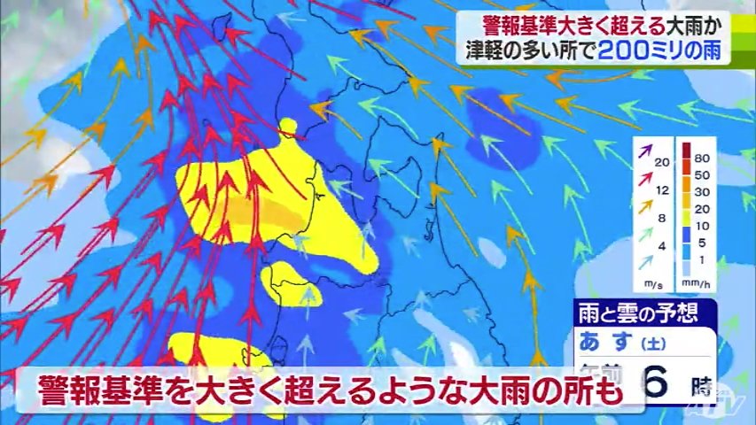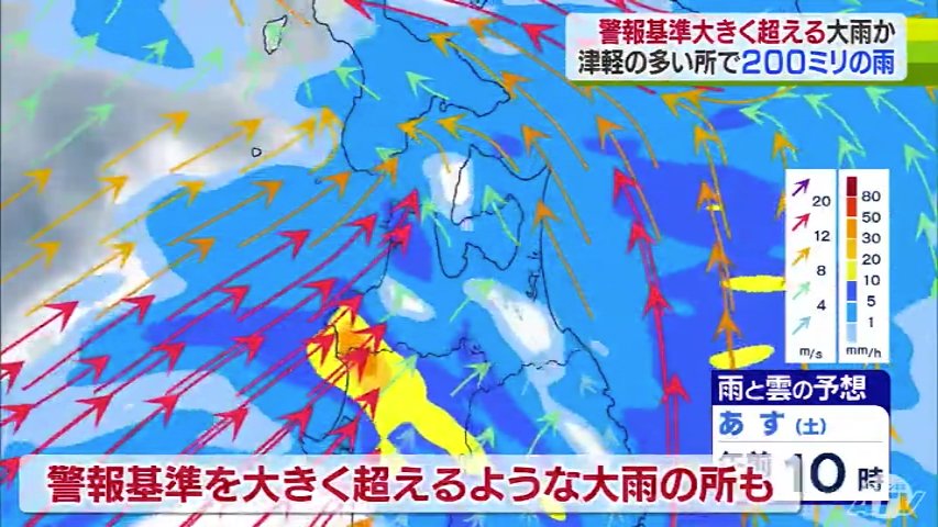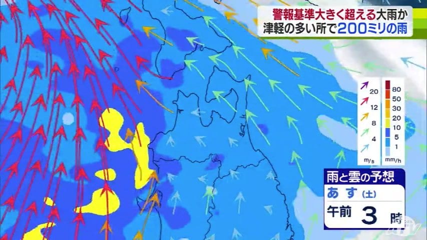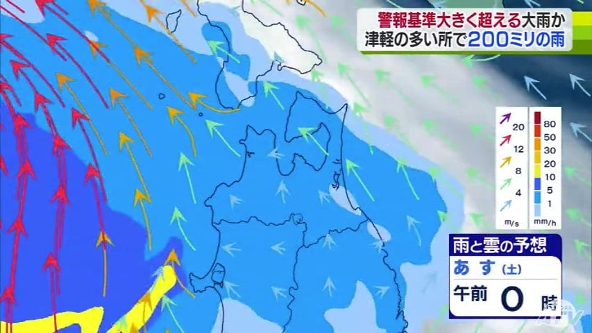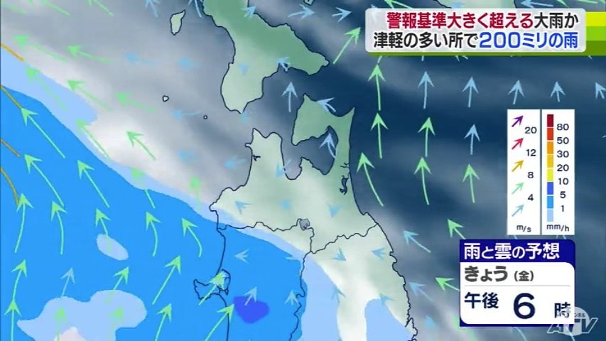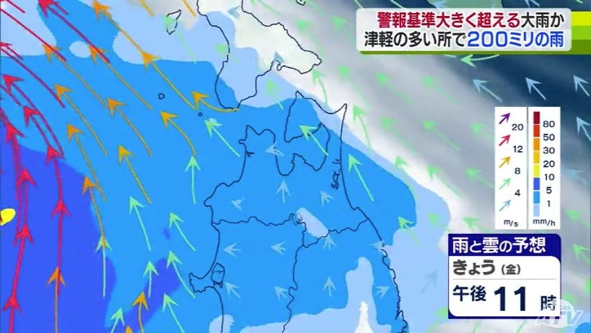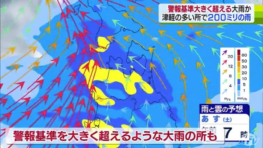 気象台によりますと、雨は今夜から降り始め、あさってにかけて津軽を中心に警報基準を大きく超えるような大雨となる所がある見込みです。