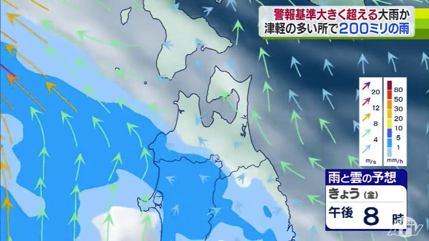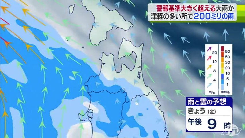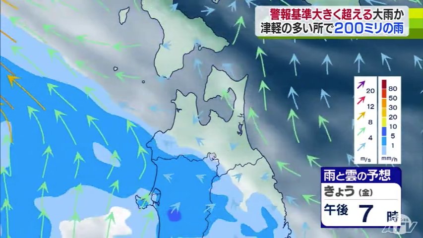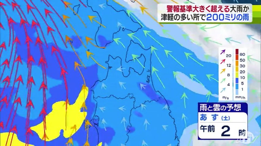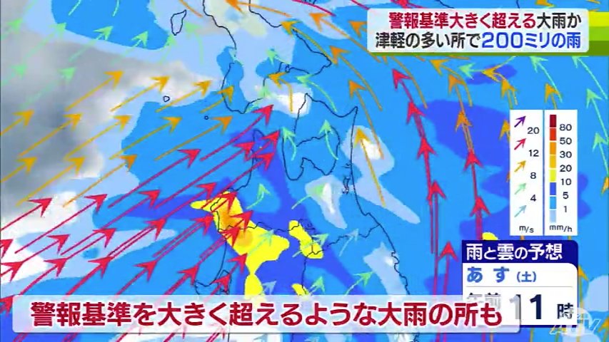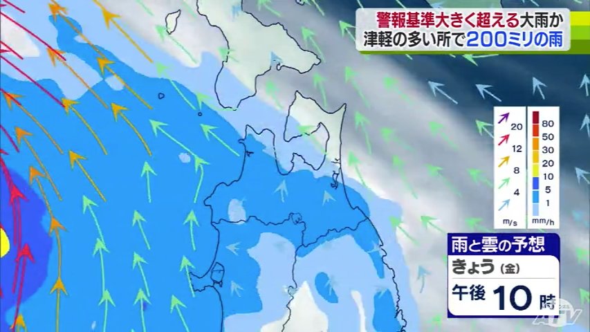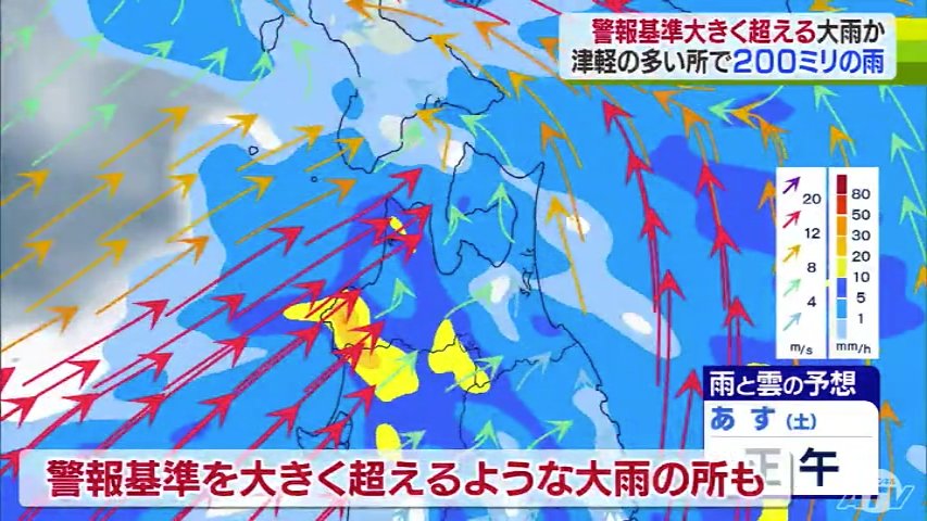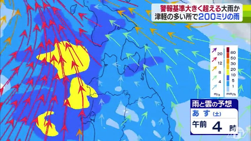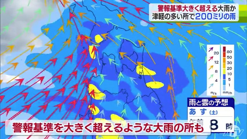 気象台によりますと、雨は今夜から降り始め、あさってにかけて津軽を中心に警報基準を大きく超えるような大雨となる所がある見込みです。