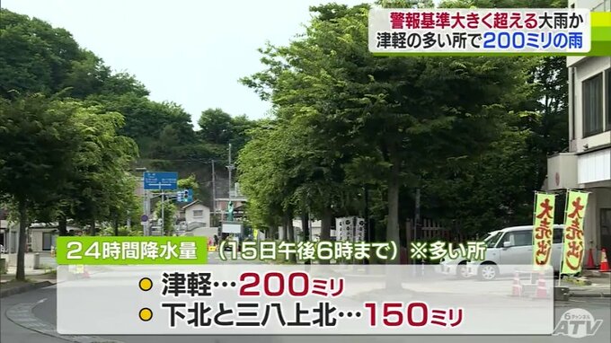 15日夕方6時までの24時間に降る雨の量は、多い所で津軽200ミリ下北と三八上北150ミリ、その後、16日夕方6時までの24時間に青森県内全域で50ミリの雨が予想されています。大雨による土砂災害や低い土地の浸水、河川の増水・氾濫に厳重な警戒が必要です。