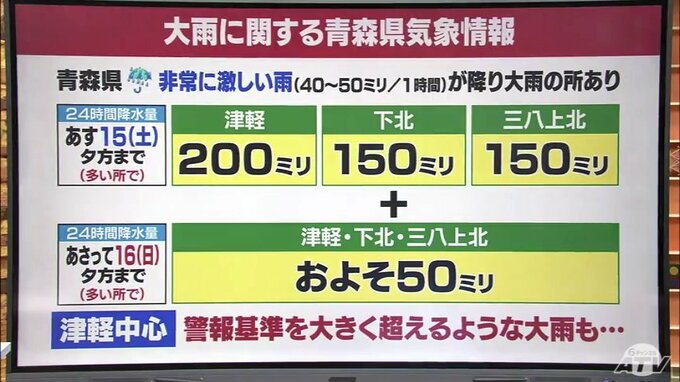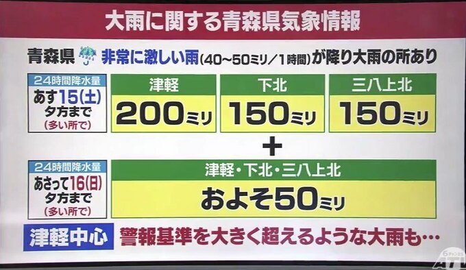 雨の量を見ていきますと、(15日夕方までの24時間降水量は)15日は多いところで津軽200ミリ、太平洋側でも150ミリ。さらに16日にかけてプラス50ミリとなりますと、警報基準を大きく超える雨が津軽を中心に予想されています。