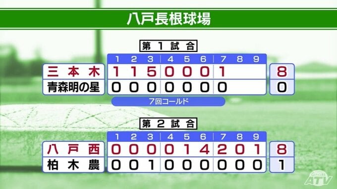 続いて八戸市の長根球場です。去年の夏ベスト16同士の青森明けの星・三本木の一戦は三本木が3回に打者一巡の猛攻で7回コールド勝ちです。八戸西は二桁安打の猛攻で柏木農業を退けました。青森高校は20歳の監督率いる八戸高専に快勝です。