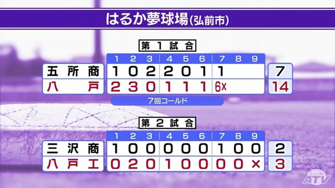 弘前市のはるか夢球場です。五所川原商業と八戸の対戦は八戸が7回裏に打線が爆発、一挙6点を奪い、試合を決めました。八戸工業は三沢商業を相手に1点差で逃げ切りました。