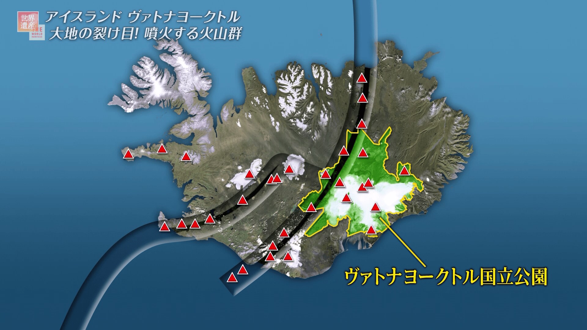 「巨大な大地の裂け目」にある世界遺産が、アイスランドのヴァトナヨークトル国立公園です。アイスランドは北大西洋に浮かぶ島国で、北海道よりも大きな島を巨大な大地の裂け目が南北に縦断しているのです。