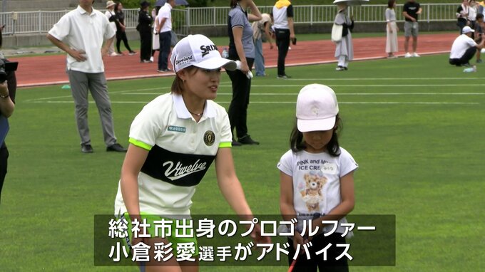 このイベントはスポーツを通じて地域の健康づくりに取り組もうと明治安田生命が開いたものです。参加した子どもたちは総社市出身の女子プロゴルファー・小倉彩愛選手にアドバイスを受けながら的をめがけてボールを打つ「スナッグゴルフ」を体験しました。