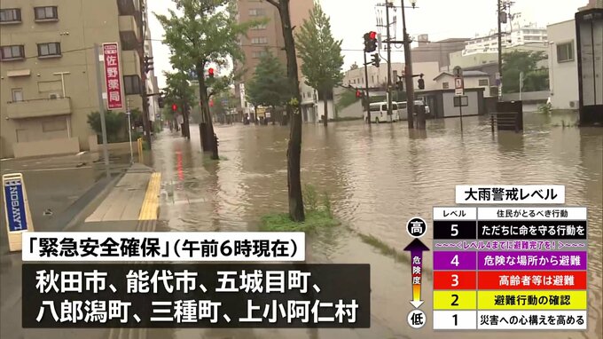 東北北部は、梅雨前線の影響で記録的な大雨となっています。秋田県内は複数の河川が氾濫し、浸水被害が相次いで確認されています。秋田市内から中継です。秋田県内では、この大雨で6つの市と町に、5段階のうち警戒…