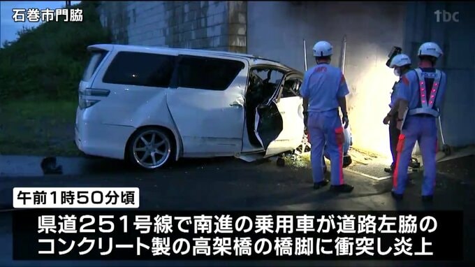 16日未明、石巻市内の県道で乗用車が橋脚に衝突し炎上しました。乗用車を運転していた43歳の男性が死亡しました。16日午前1時50分頃、石巻市門脇の県道251号線で南に向かっていた乗用車が道路左わきのコンクリート…