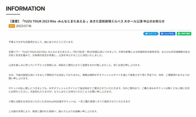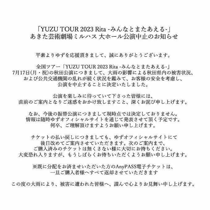 全国ツアー「YUZU TOUR 2023 Rita -みんなとまたあえる-」7月17日(月・祝)の秋田公演を、「大雨の影響による秋田県内の被害状況、および公共交通機関の乱れが続く状況を鑑みて、お客様の安全を考慮し、公演を中止」することを発表しました。