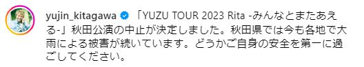 また、ゆずの北川悠仁さんは自身のインスタグラムで「YUZU TOUR 2023 Rita -みんなとまたあえる-」秋田公演の中止が決定しました。秋田県では今も各地で大雨による被害が続いています。どうかご自身の安全を第一に過ごしてください。」とメッセージを綴りました。