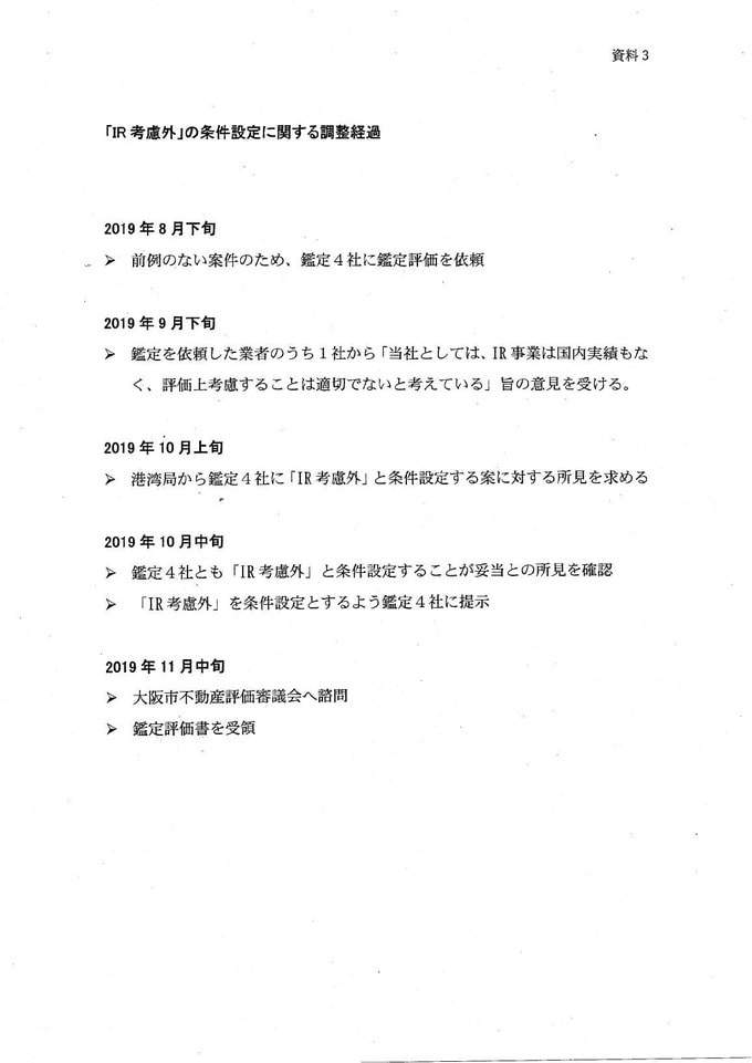 大阪港湾局はこれまで「IRを考慮外」とする条件について、2019年9月下旬、鑑定業者1社から「IR事業は国内実績もなく、評価上考慮することは適切ではない」という意見を受け、10月上旬に、大阪港湾局から鑑定業者4社に「IRを考慮外」とする条件について意見を求め、10月中旬に鑑定業者4社から妥当との意見を得たことから「IRを考慮外」と提示したと説明してきました。