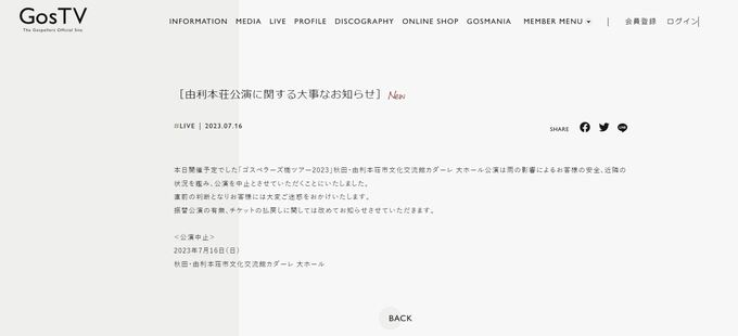 ヴォーカル・グループのゴスペラーズが本日16日に開催予定だった「ゴスペラーズ橋ツアー2023」秋田・由利本荘市文化交流館カダーレ 大ホール公演を中止することが公式サイトで発表されました。