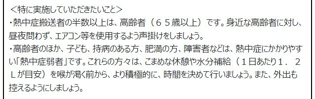 ムリな外出はなるべく避ける、エアコンを適切に使って涼しい場所で過ごす、こまめな水分補給を意識するなど、熱中症には厳重に警戒してください。