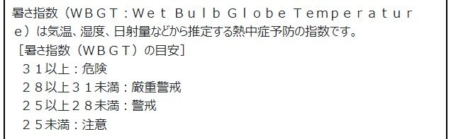 この「熱中症警戒アラート」は、熱中症の危険度を表す指標の一つである暑さ指数(WBGT)が33以上の地点が県内のどこかで予想される場合に発表されます。暑さ指数は気温だけでなく、湿度や日射量などから決まる指数です。
