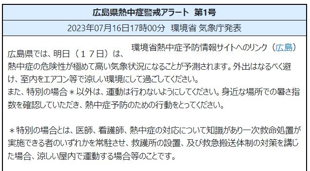 17日(月)の広島県は、熱中症の危険性が極めて高い状況が予想されるとして、気象台は16日(日)夕方、広島県を対象に「熱中症警戒アラート」を発表しました。