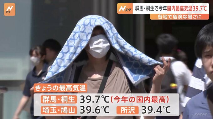 きょうは東日本と西日本の広い範囲で気温35度以上の猛暑日となり、特に関東地方では群馬県内で今年の最高気温の1位の値を更新し、40度に迫る危険な暑さとなっています。記者「JR大宮駅前です。午後2時現在、手元の…