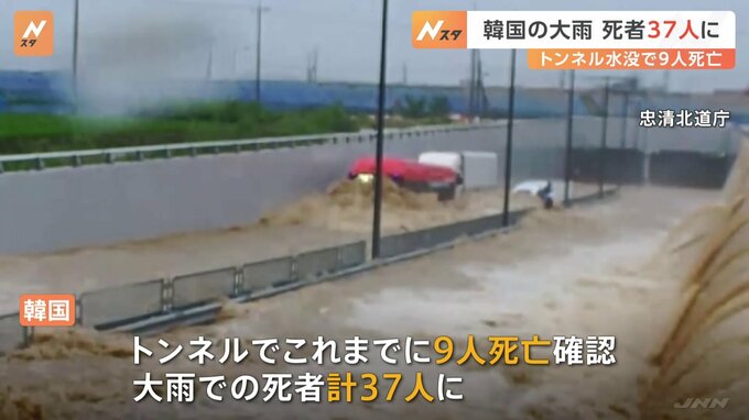韓国では13日からきょう午前までに多いところで570ミリ近くの雨が降り、中部・清州では地下トンネルが水没しました。トンネルではこれまでに9人の死亡が確認され、大雨での死者はあわせて37人となっています。きょ…