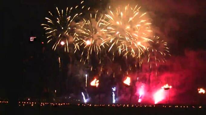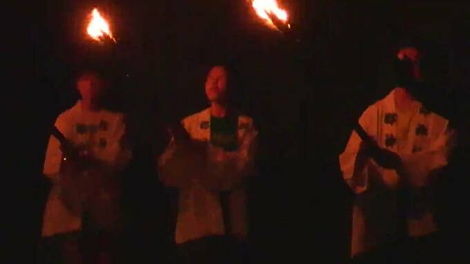 年男・年女の小学6年生6人がたいまつを手に境内を3周し、燭台(しょくだい)に火をつけます。それを合図にあぜ道に配置された800本の燭台に次々と火がともされ、田園は幻想的な光に包まれました。