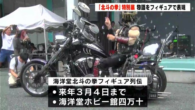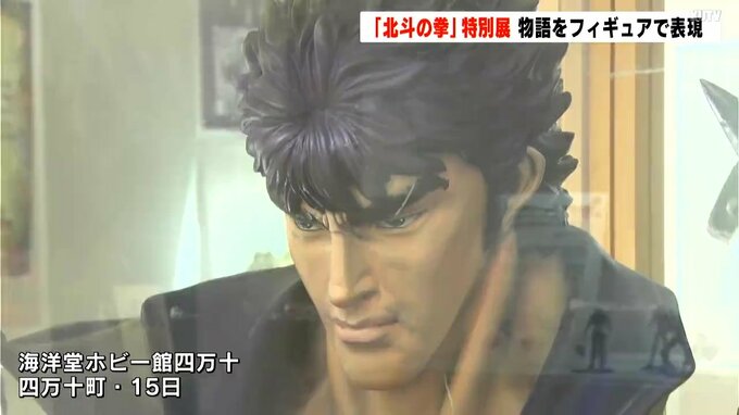 四万十町打井川(うついがわ)の「海洋堂ホビー館四万十」で15日から始まった特別展「海洋堂北斗の拳フィギュア列伝」。特別展は人気漫画「北斗の拳」をテーマに、出会い、別れ、闘いなど数々のドラマを経て真の救世主へと成長していくケンシロウの物語を、フィギュアの世界で表現しています。