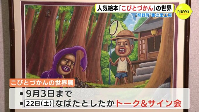 熊野町の「筆の里工房」には、作家・なばたとしたか さんの筆を使った絵本の原画やイラスト、フィギュアなど321点が並んでいます。