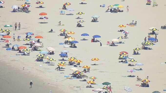 「愛知県南知多町の内海海水浴場です。海の日ということもあって大勢の人が海水浴を楽しんでいます」