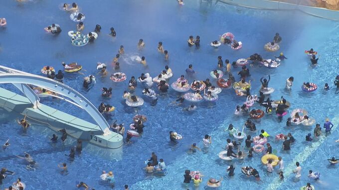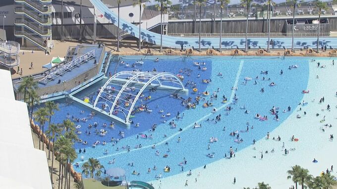 「三重県桑名市のナガシマ ジャンボ海水プールです。大勢の人がプールを楽しんでいます。ジェットコースターで暑さを振り払っているのでしょうか」