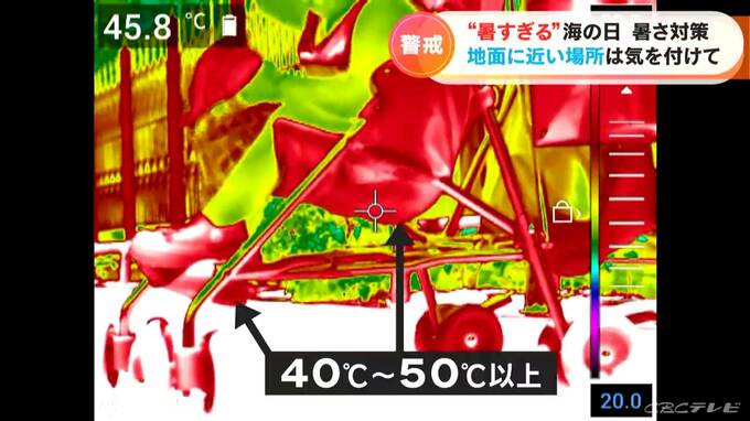 こちらはベビーカーを押すお母さん。明らかに地面に近い赤ちゃんのお尻や足の裏は真っ赤で、40度~50度に。地面の照り返しが強烈な証拠です。