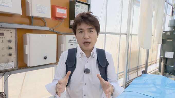 「イチゴハウスの中にいます。ハウス内の温度が38度。このままだと熱中症になってしまうので、農家さんは、背中に脇の下に保冷剤が入っているベストのようなもの着て、暑さをしのいでいる。確かに楽かもしれない」