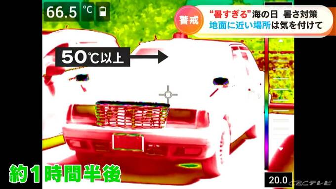まずは、エアコンをつけた状態の車です。フロントガラスの部分は「緑」で表示されていましたが、エアコンを切って約1時間半後。50度を超える白い表示になりなりました。