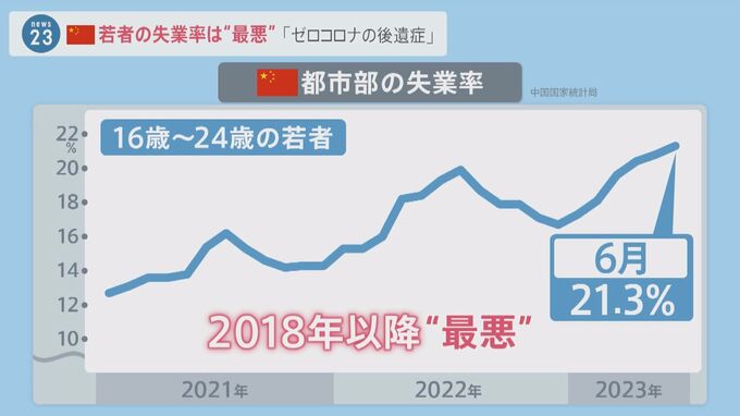 7月17日に発表された、6月の都市部に住む若者の失業率は21.3%。これは記録が確認できる2018年以降で最悪の数字です。