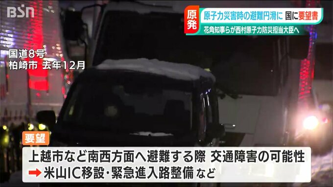その上で、スマートインターチェンジの増設を求めた他、豪雪など悪天候で、柏崎市・刈羽村から上越市など南西方向へ避難する際に交通障害が起きる可能性を踏まえ、より市街地に近い位置で北陸道に入れるよう米山インターチェンジの移設や緊急進入路の整備などを求めたということです。