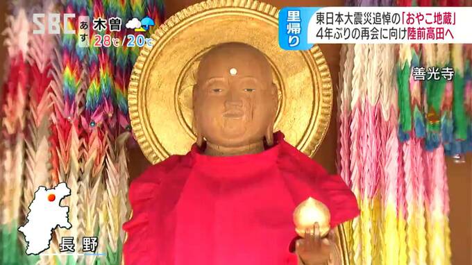 東日本大震災で被災した岩手県陸前高田(りくぜんたかた)市の松で作られ、善光寺に安置されている「おやこ地蔵」が、4年ぶりに里帰りすることになりました。善光寺の本堂脇の地蔵堂に安置されている「おやこ地蔵…