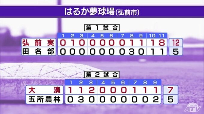 弘前市のはるか夢球場の第1試合は弘前実業が延長11回に8得点と打線が爆発して田名部を下しています。第2試合は大湊が五所川原農林を振り切り3回戦進出です。