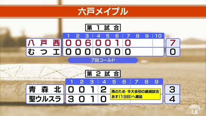 六戸メイプルは八戸西がむつ工業を7回コールドで破っています。青森北と八戸聖ウルスラの第2試合は雨のため青森県初の継続試合となりました。