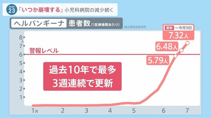 翌週は6.48人で警報レベルとされる6を上回り、7月18日に発表された最新のデータでは7.32人。3週連続で過去10年間の最多を更新しています。