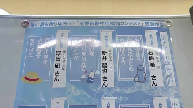 標語は、熱中症で病院に搬送される人を少なくしたいと、玉野市教育委員会や大塚製薬などが市内の小・中学生を対象に募集したものです。