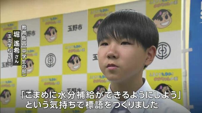 (教育長賞【中学生の部】玉中学校2年 堀 遙希〈はるき〉さん)「こまめに、水分補給ができるようにしようという気持ちで標語をつくりました」