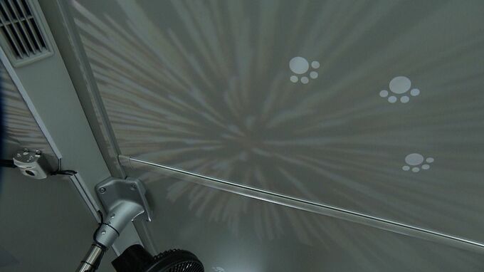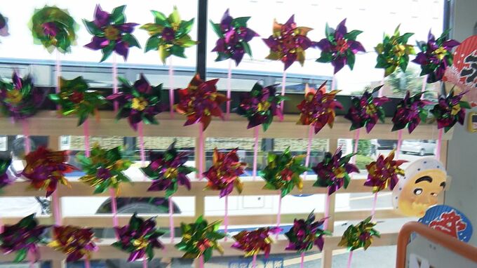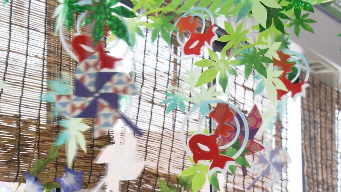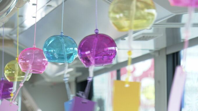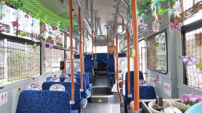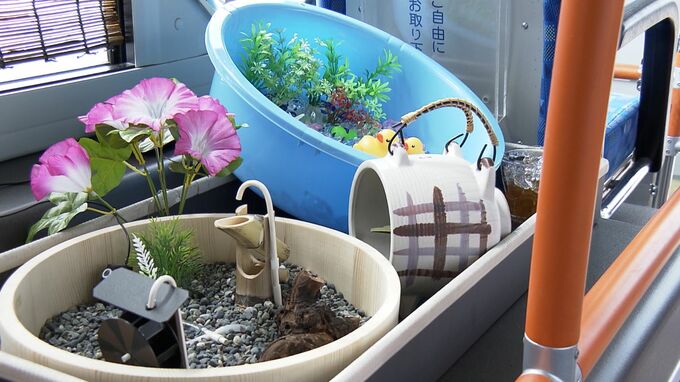 バスの車内に風車や風鈴などが涼しげに飾られているほか、蚊取り線香や鹿威し(ししおどし)なども涼を感じさせてくれます。