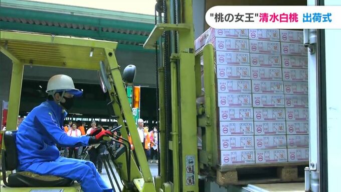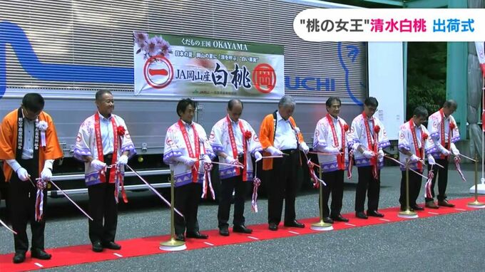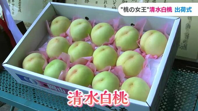 やわらかく上品な甘さが特徴の清水白桃です。岡山を代表する夏の味覚の販売が本格化するのを前に、岡山市北区の選果場で出荷式が開かれました。
