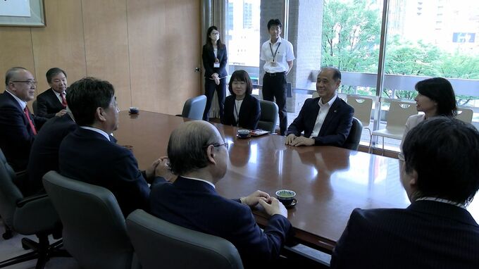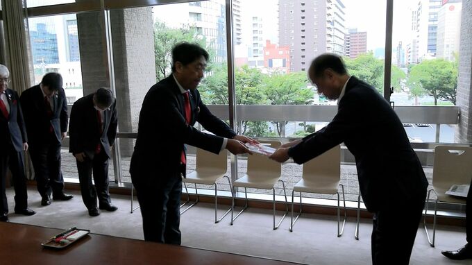 岡山市役所で贈呈式が行われ、岡山東ロータリークラブの佐々木篤会長から大森市長に目録が手渡されました。
