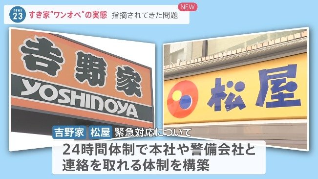 news23の取材では、他の牛丼チェーンである吉野家と松屋は一部の店舗でワンオペを実施しているということです。緊急対応については、共に24時間体制で本社や警備会社と連絡を取れる態勢を組んでいるそうです。