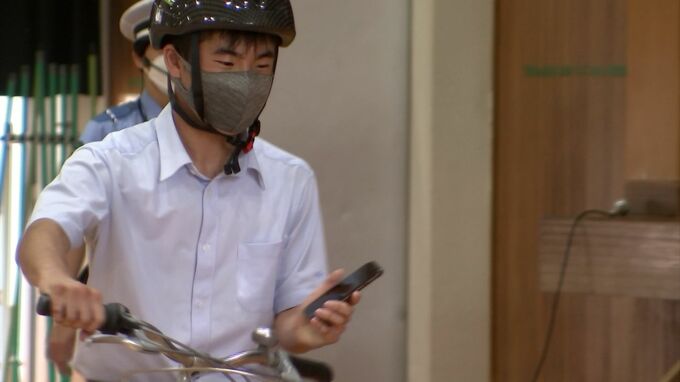 スマホを見ながらの運転でふらつく自転車。交通安全教室の一幕です。自転車に乗る機会の多い高校生に「ながらスマホ」の危険性に気づいてもらおうと、KDDIと高松北警察署が行いました。