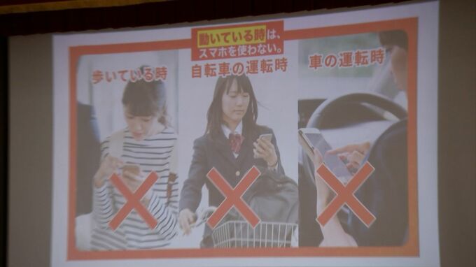 交通安全教室では、動きながらスマホを使わない習慣を身につけることで事故の防止をと呼びかけていました。