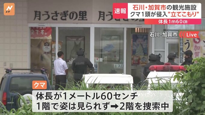 けさ、石川県加賀市の観光施設にクマ1頭が侵入しました。クマは現在も施設内にいるとみられ、警察や猟友会が捕獲の準備を進めています。きょう午前8時半ごろ、石川県加賀市の「月うさぎの里」の従業員から、「店に…