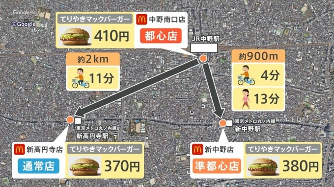 さらに、JR中野駅から約2キロ離れた東京メトロ・丸の内線、新高円寺駅の新高円寺店(通常店)では▼370円。中野南口(都心店)と比べると▼40円の差がありますが、自転車で11分の距離です。