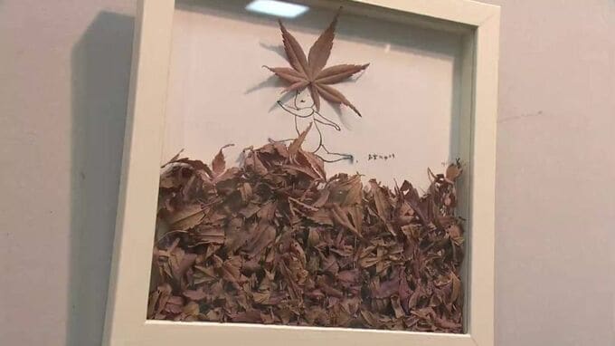 会場には木の葉をコラージュした作品や、今年6月に出版された新作絵本の原画など約40点が展示されています。