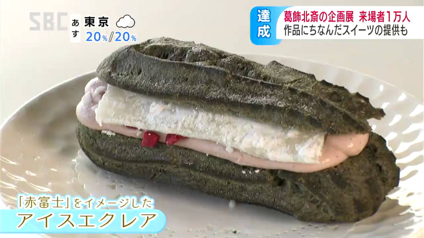 期間中、3階にあるカフェでは北斎の作品「赤富士(あかふじ)」をイメージし、イチゴクリームなどを使ったアイスエクレアを提供しているということです。