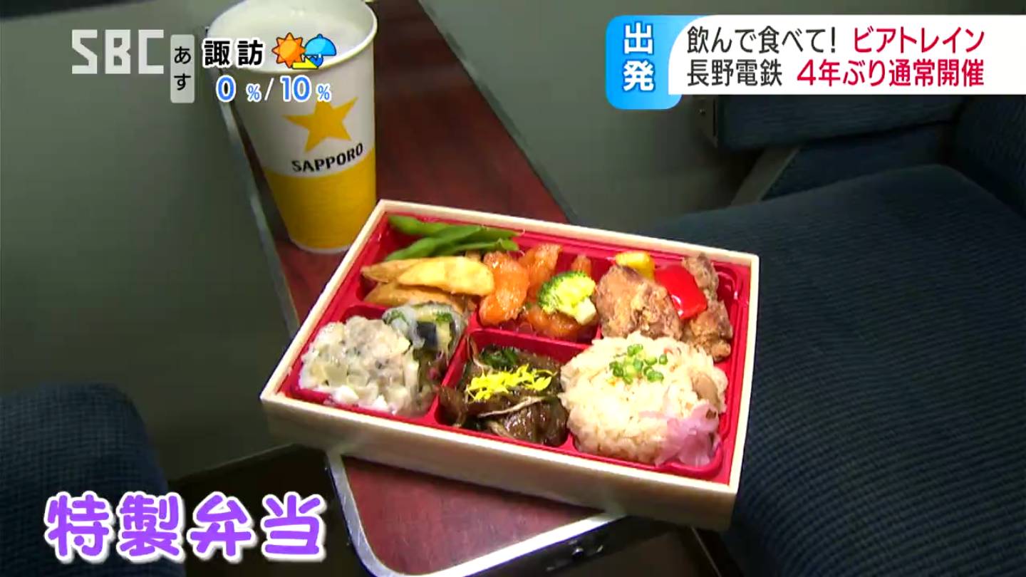 車内ではビールやハイボールの飲み放題だけでなく、唐揚げや枝豆などつまみにぴったりな特製弁当も楽しむことができます。